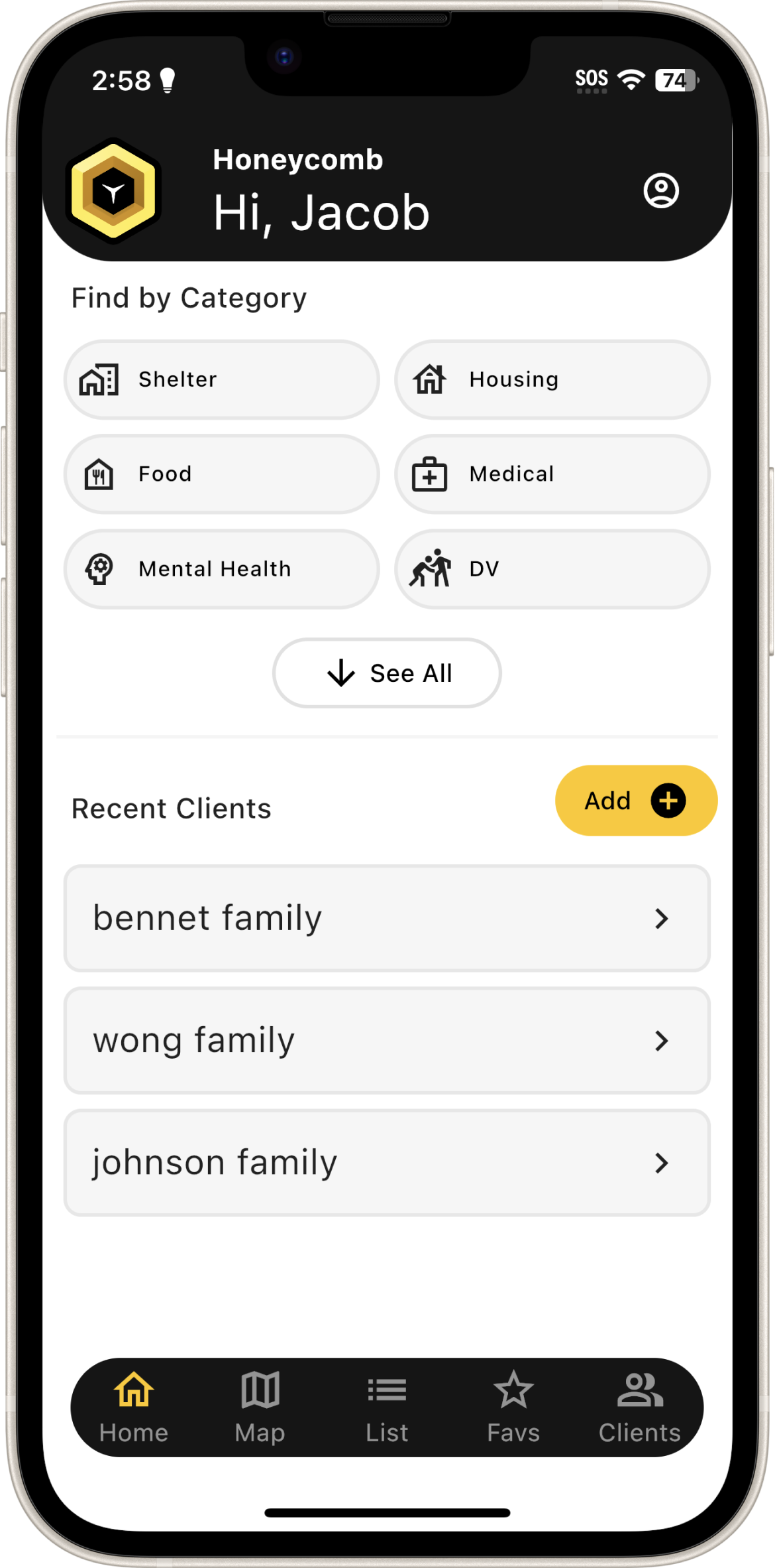Clients details where users create profiles, use a scratch pad to document family needs, add resources & share/print from the app.