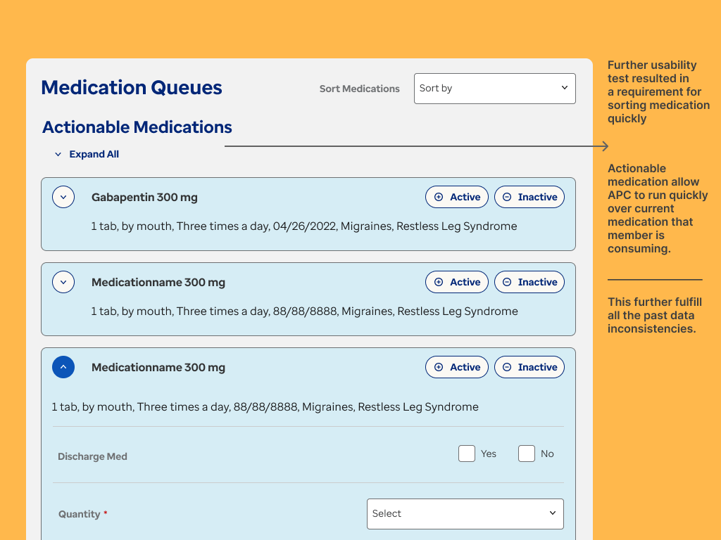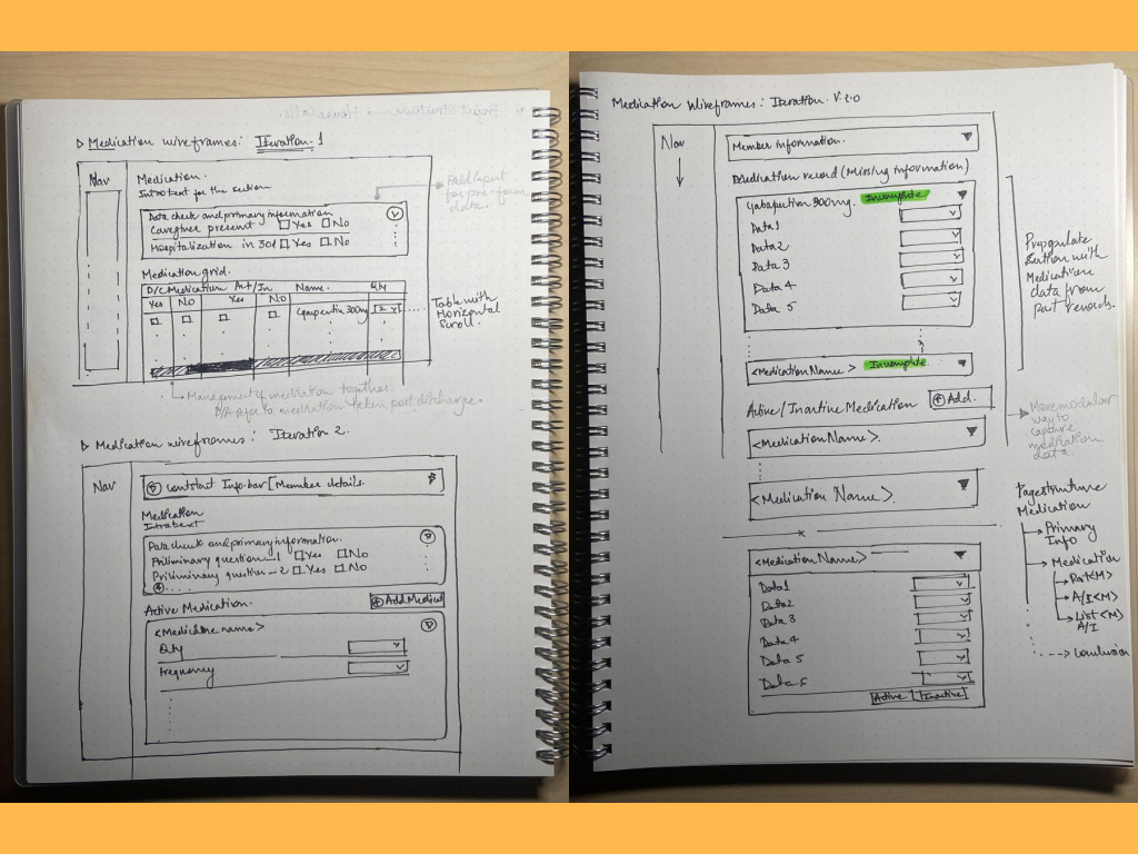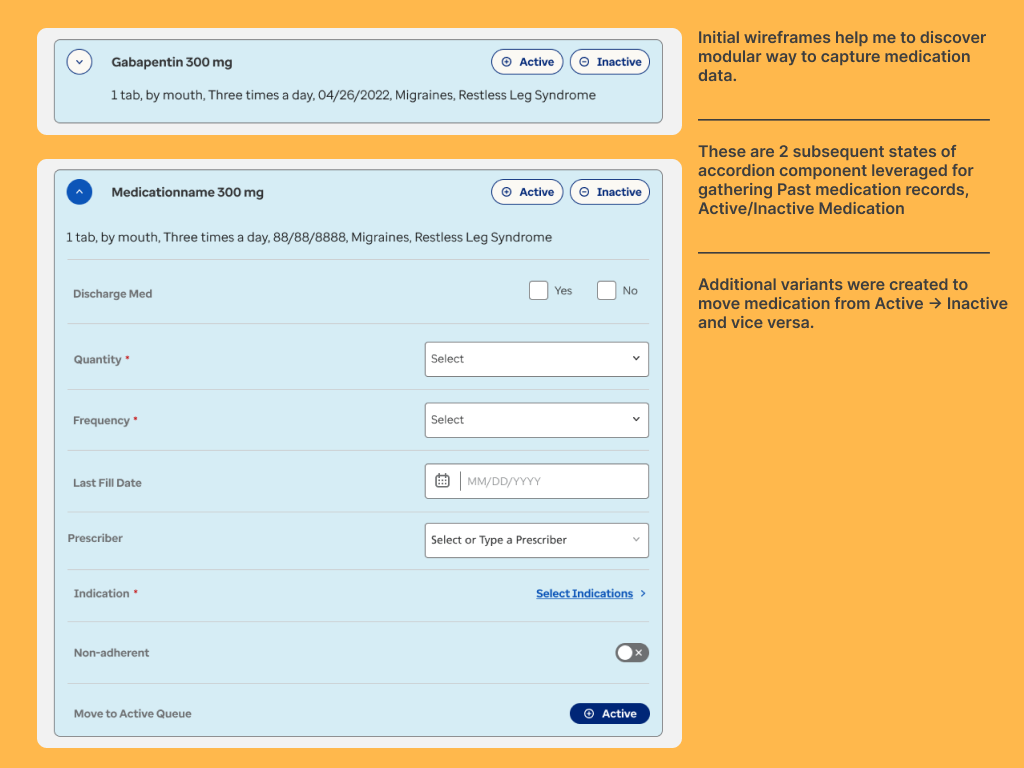 Ideated 3 versions to separate data and presented to APCs. Key outcomes include a two step approach, first allow APC to collect information for past medication and later mark Active/Inactive medications.