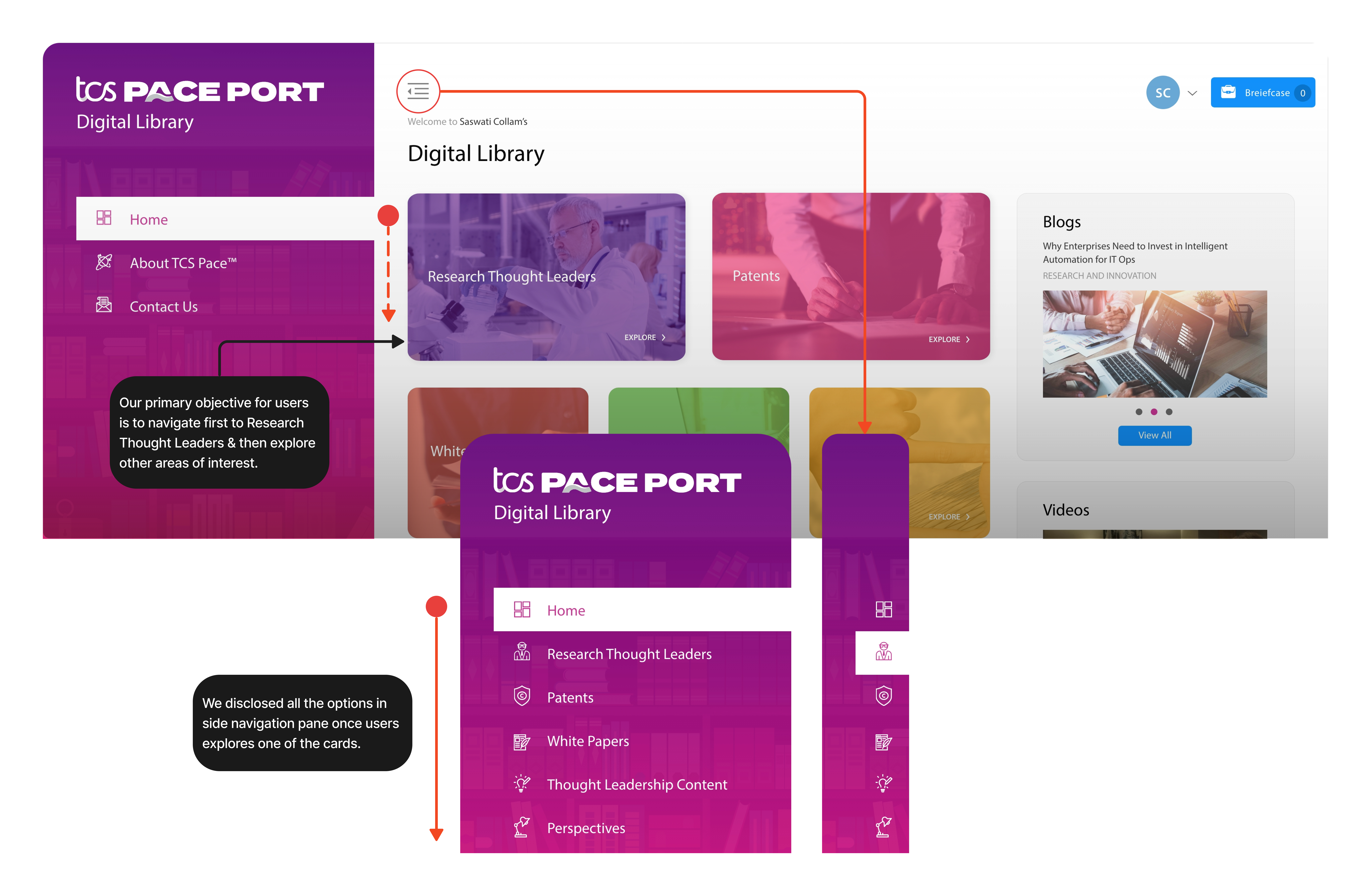 - Quick mock-ups using design system on existing UX patterns to conceptualize digital library.